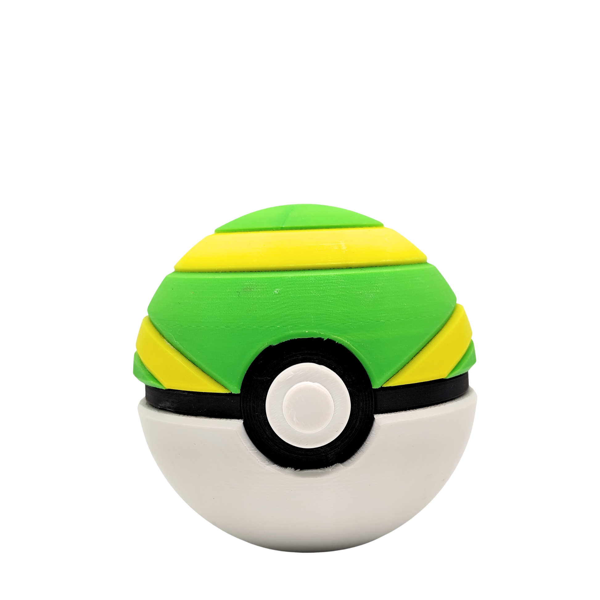Pokéball inspirada en la Nest Ball, con tonos verdes vivos pensada para capturar Pokémon de nivel bajo.